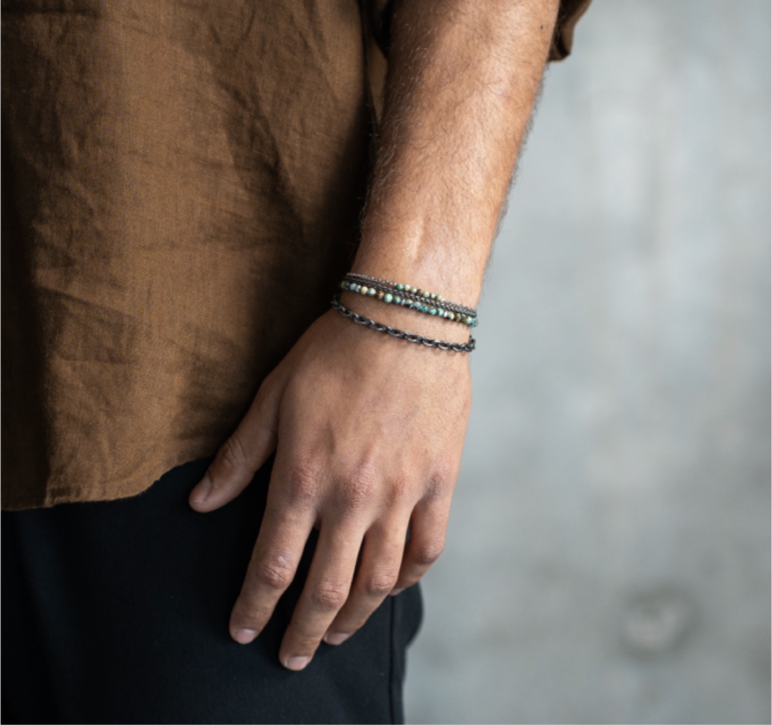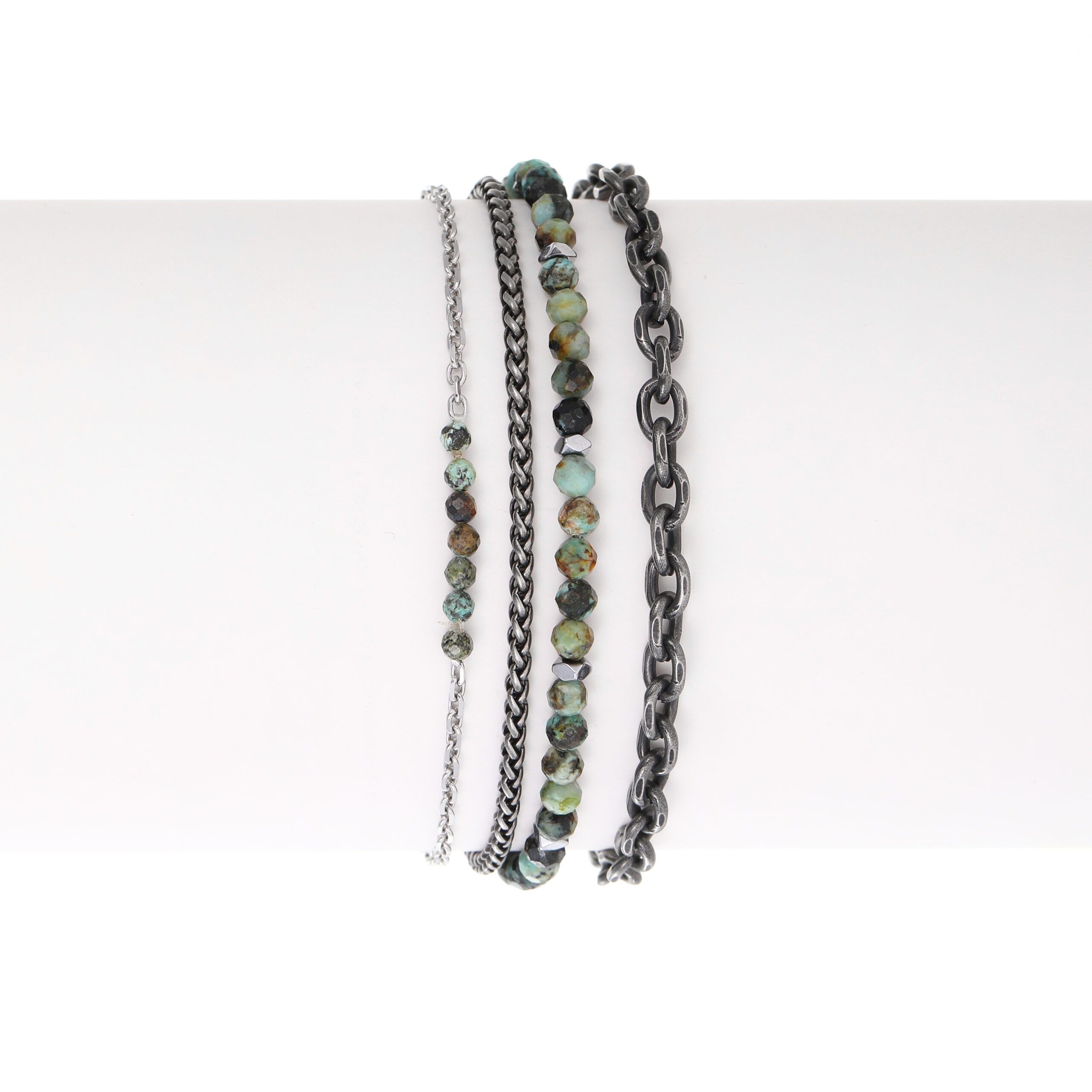 STACKED GREEN STONE BRACELET׳ הוא סט צמידים משולב עם אבנים טבעיות בגווני ירוק, לצד אלמנטים כסופים נקיים.